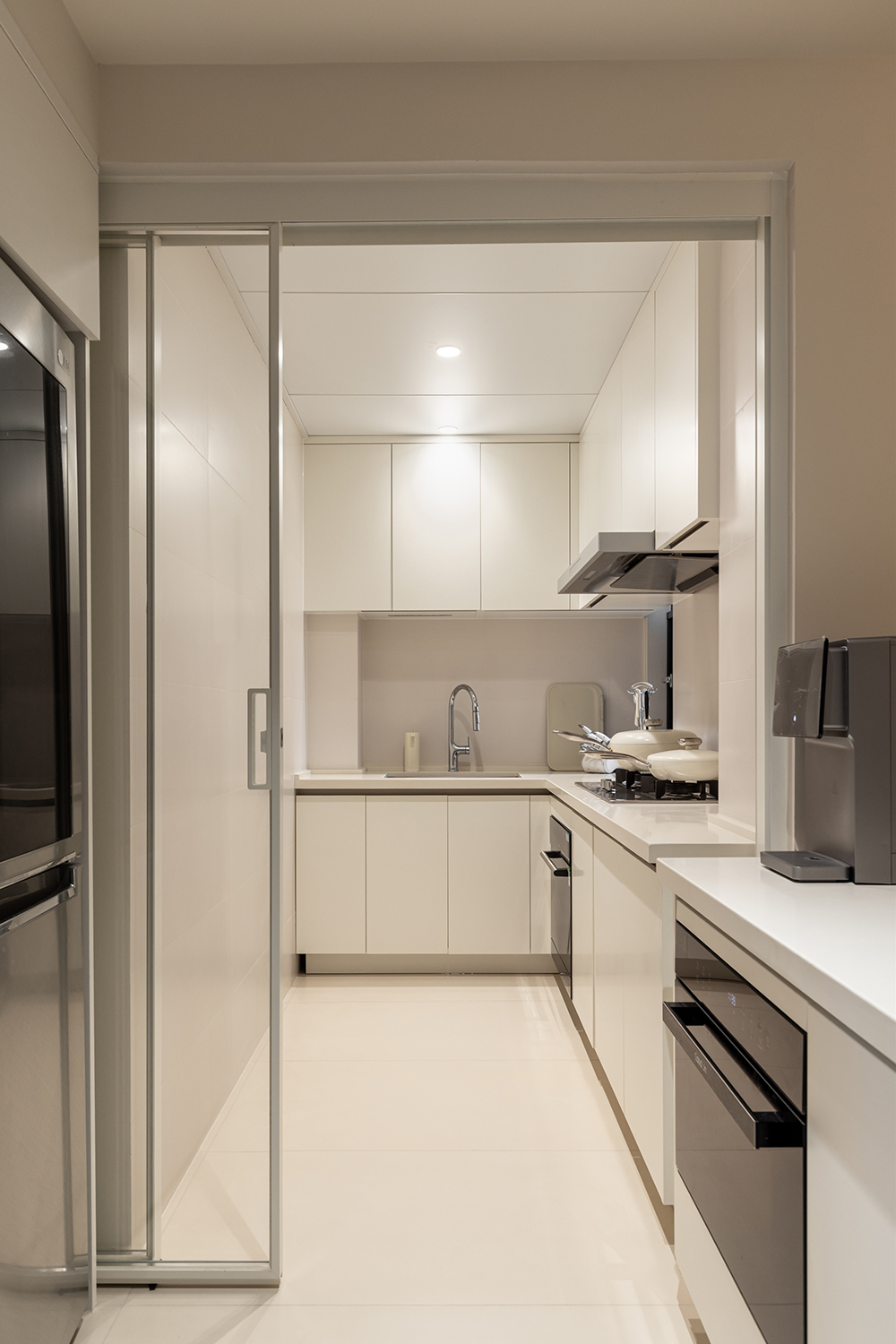 厨房在色系上和客厅保持一致,在设计师的推荐下,业主把热水器藏在了吊柜中,所以我们并没有看到热水器的踪影。