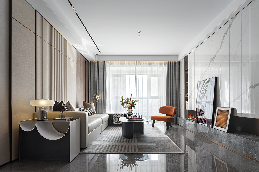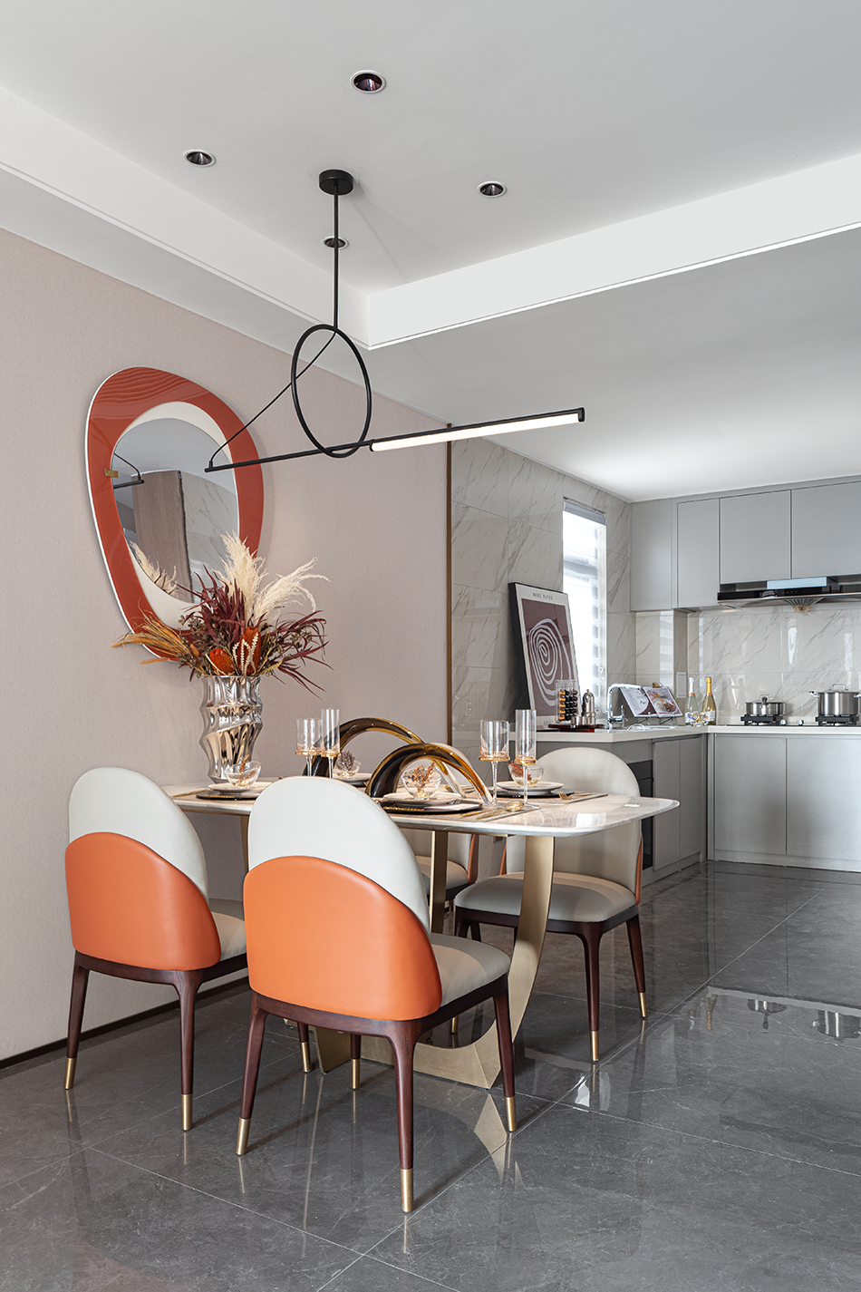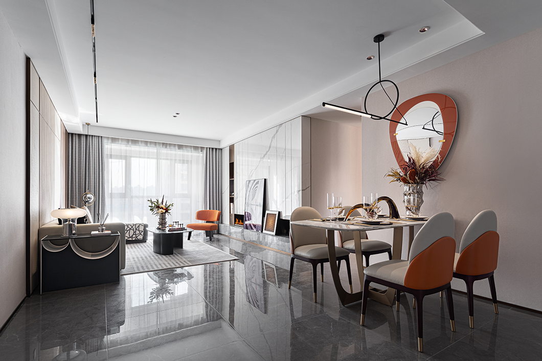 餐厅里橙色米色结合的餐椅,与客厅的沙发遥相呼应。金属玻璃材质的饰品映照在墙上的装饰镜中,共同营造出用餐的仪式美感,诠释了现代轻奢空间的气质。
