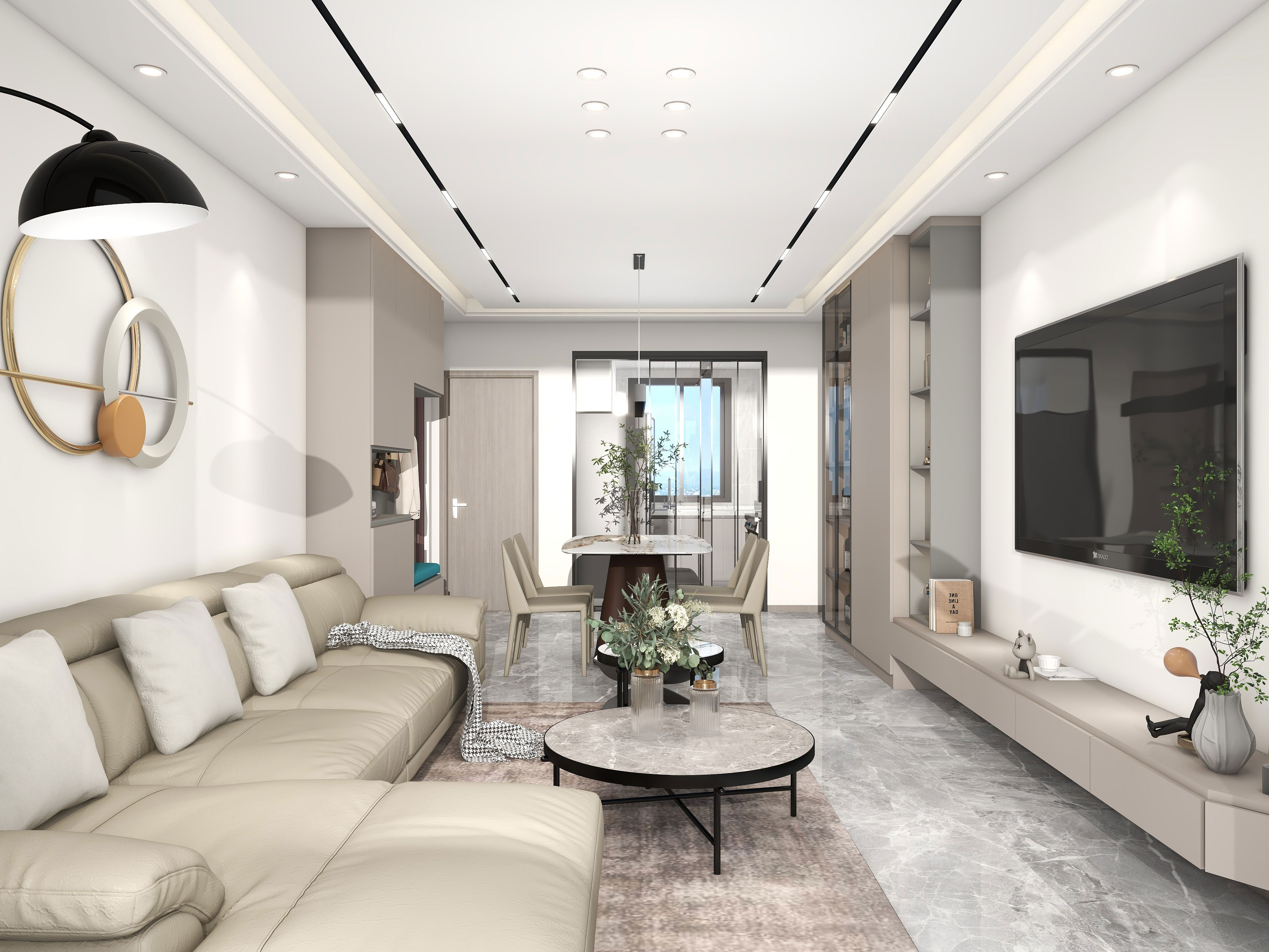 电视背景墙做了满墙电视柜,极简设计,内部储物空间也很强大。电视与柜子嵌平,电视插座和网络端口都藏在柜内。电视机下方选择了3500k灯带搭配深灰色岩板地台,拉升空间层次感。