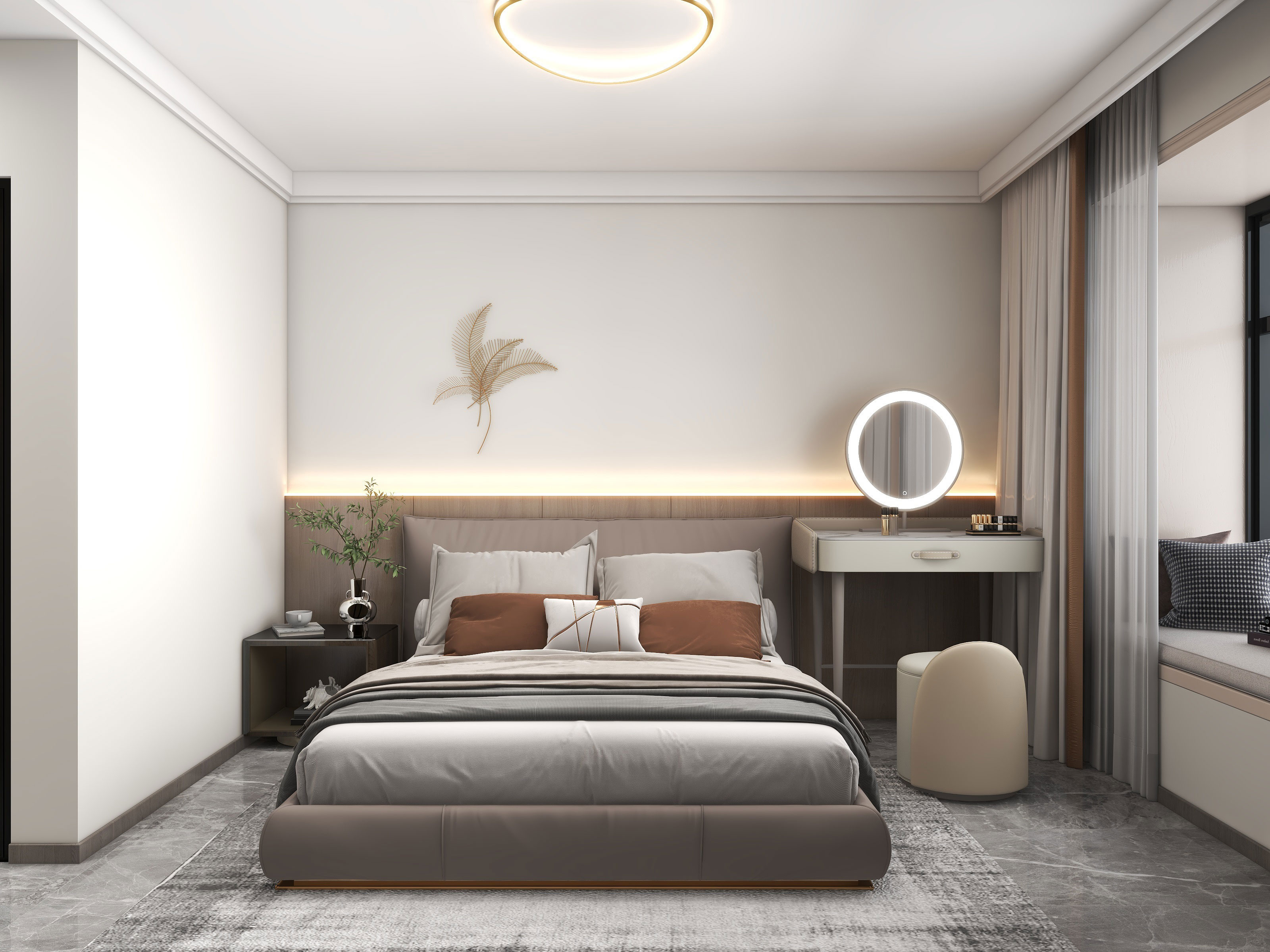 卧采用半墙木饰面做背景,床头灯带遵循极简风格,见光不见灯,提升高级氛围感。背景墙上半部分是和客厅同款不同色的艺术墙布,相互呼应保持了空间连贯性。主卧不安装电视机,但是在衣柜前暗藏了投影幕布槽,满足业主的观影需求。