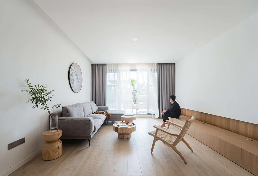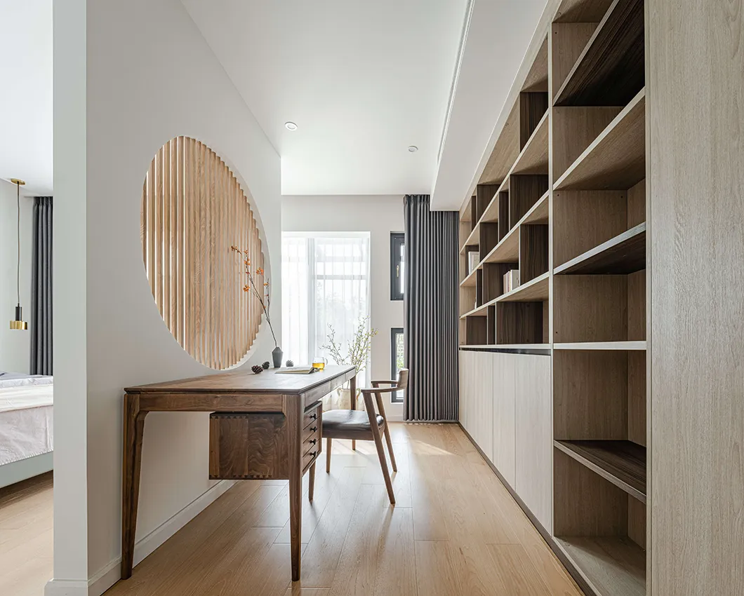 原木新中式装修风格,留白客厅超质朴纯粹,书房卧室隔“窗”相望,纯粹的空间让人内心平和又放松,去除浮躁,回归生活本质。