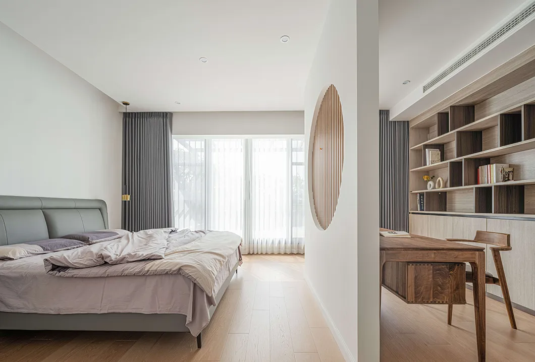 卧室的设计,一张大床、一面木墙,以及斑驳梦幻的光影交织,便将恬静的氛围装点得甚是迷人。书桌与主卧床体相隔而望,似透非透的朦胧感增加了空间的美感。一轮圆月再加一本好书,就可以度过惬意的闲暇时光。