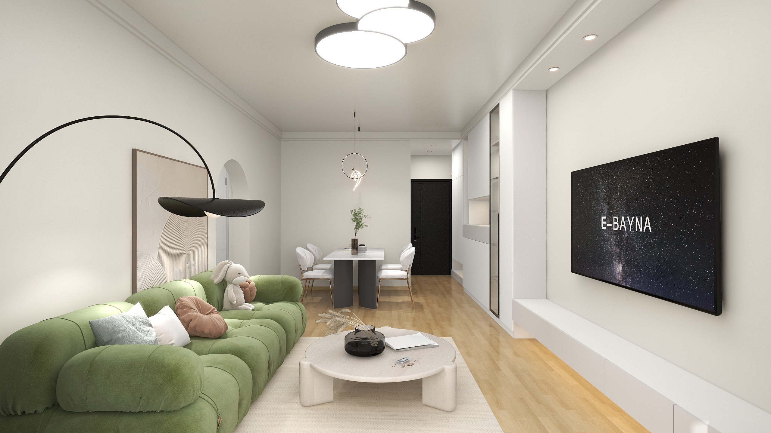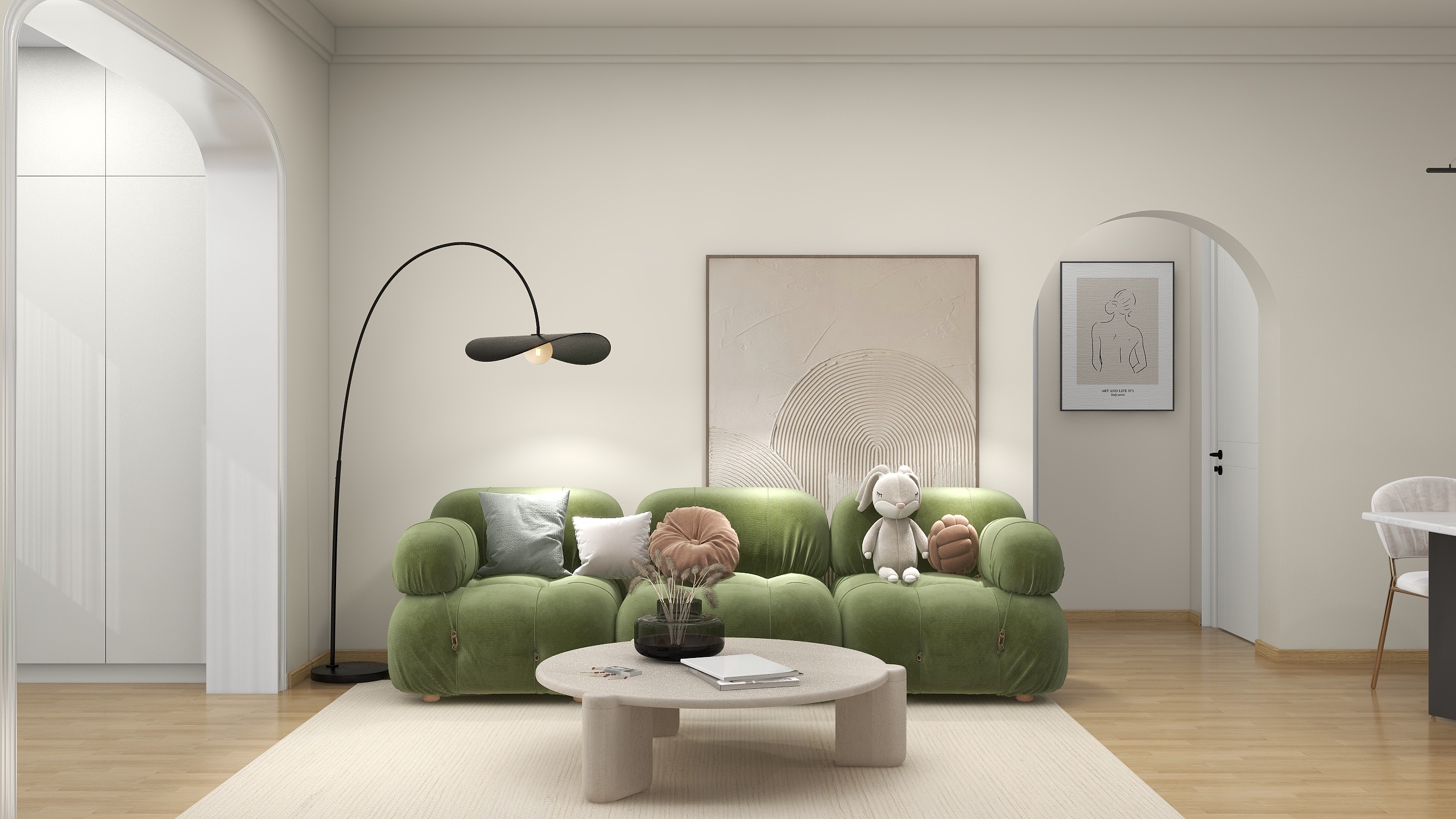 奶油色分格,奶油色是一种淡淡的奶咖色,在米白色与奶咖色之间的色系,奶油色是一个低饱和度的配色风格。在此基础上,再搭配米色、暖灰色、原木色等其他饱和度比较低的色彩,最后再用一些带有重色的家具、木料或墨绿的植物,起到对比和突出的视觉效果,奶油色可以和现代极简,侘寂,日式,法式等灵活的结合。