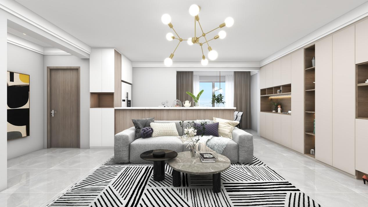 公共区域用整墙柜子增加储物空间,鞋柜延伸到餐边柜,客厅延伸到餐厅。水吧台完美分割区域,双层石膏板又把空间连贯起来,独立而又统一。