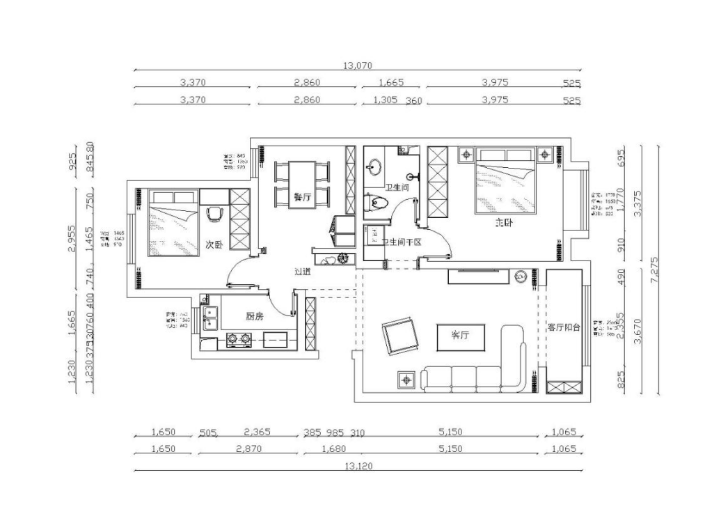 采用灰色调为主体,用黄色进行点缀,整体空间和谐,吊顶、墙面用金属线条进行装饰,电视柜白色加上金属线条进行装饰,突出空间的层次感,整体空间家具相对较少。