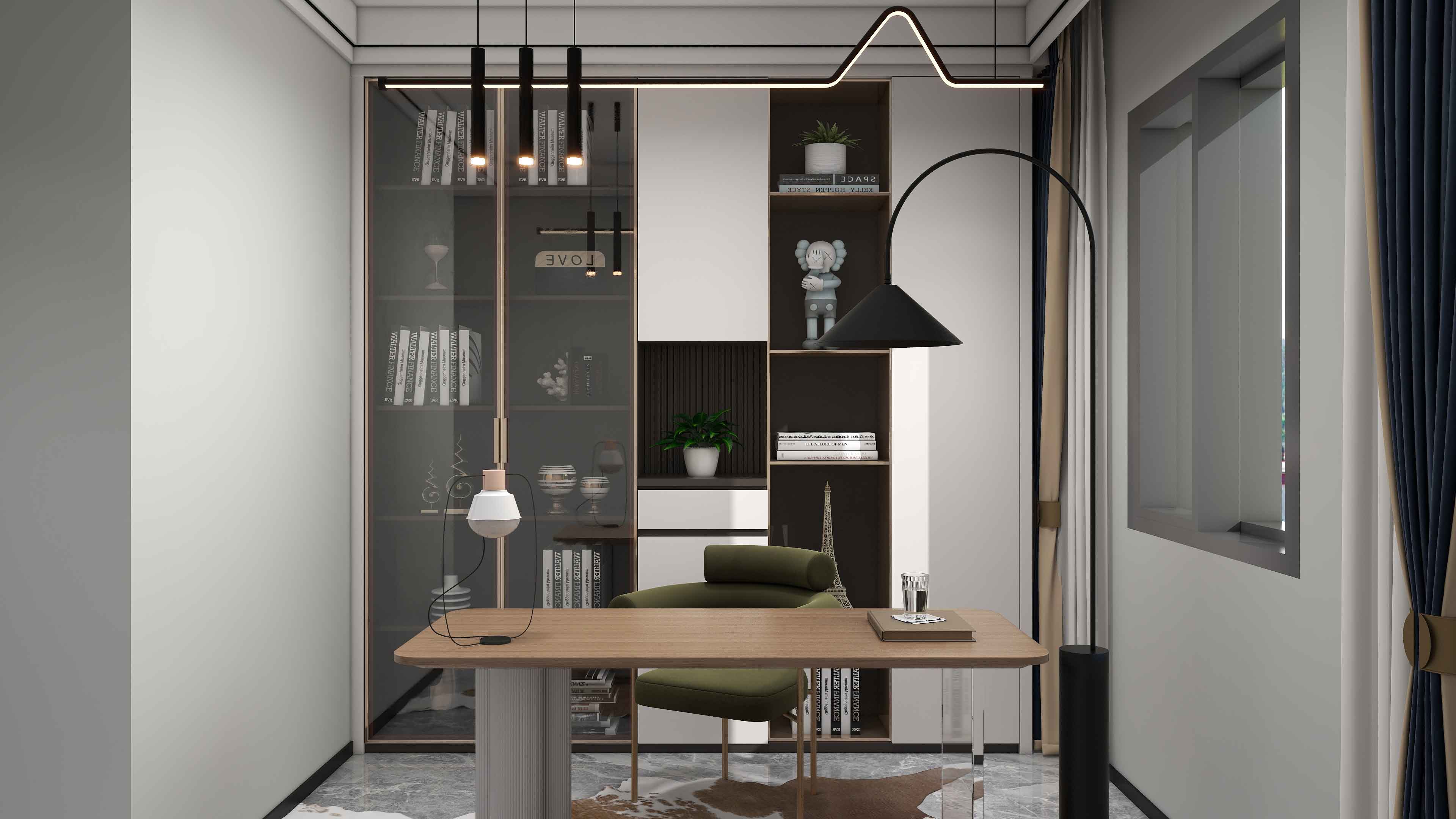 单独的阅读空间,也可作为办公空间或娱乐空间使用,与卧室、公共空间互不打扰,部分开放格也可放置孩子证书,乐高玩具等。