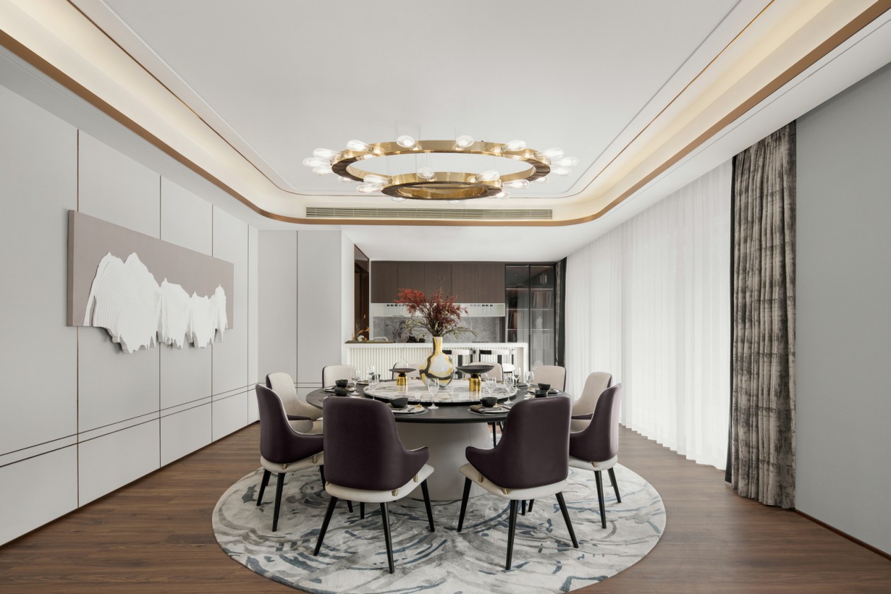 餐厅灯光也选择简单的吊灯或吸顶灯作为主灯照明,色相选择暖白光,起简单的照明作用,吊灯距离餐桌的高度在70~90CM之间,若是层高低的小户型,餐厅灯光可用射灯和筒灯代替吊灯。